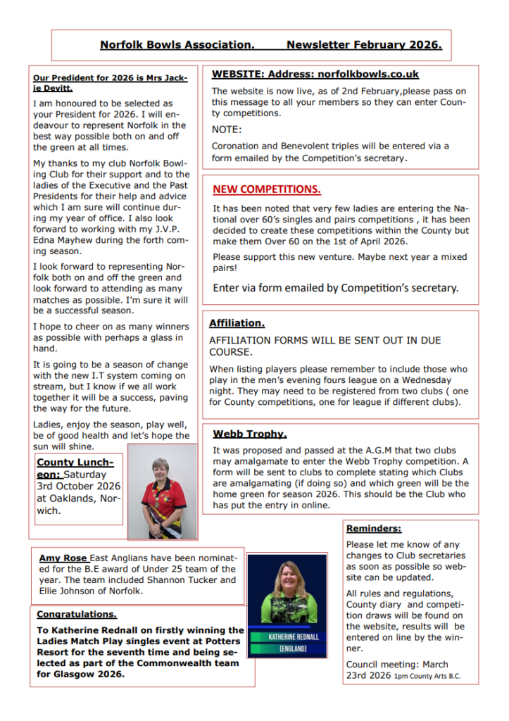 Keep up to date with news from Bowls England Want to keep up to date with news from Bowls England then why not sign up to receive their monthly newsletter, “The Jack”? Sign up is easy, just go to the Newsletter Sign-up tab on the Bowls England home page or just CLICK HERE and get […]